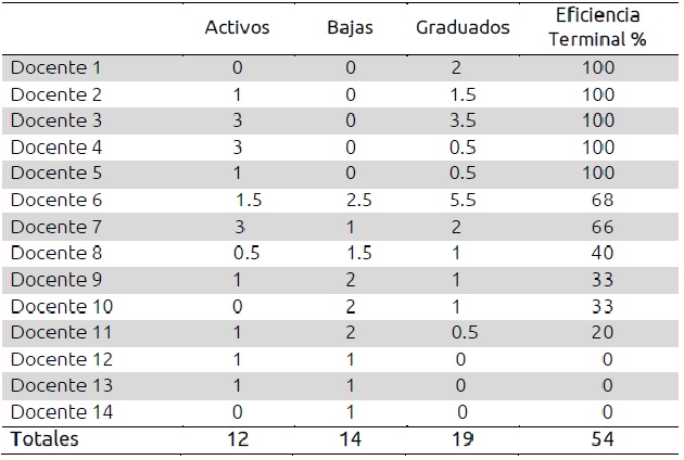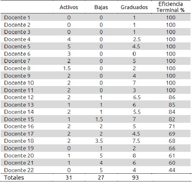 La tabla III identifica la eficiencia terminal por profesor del programa de la MTA. La tabla contempla información de enero 2007 a febrero 2016. Se cuantificaron 120 alumnos, de ellos 31 permanecen activos, es decir, aún están cursando la maestría; 93 se graduaron, y 27 fueron dados de baja. Se analizó la eficiencia terminal de 22 profesores. Únicamente uno presenta baja eficiencia terminal con 44%, 10 de ellos están entre el 60% y 86% y 11 tienen el 100%.