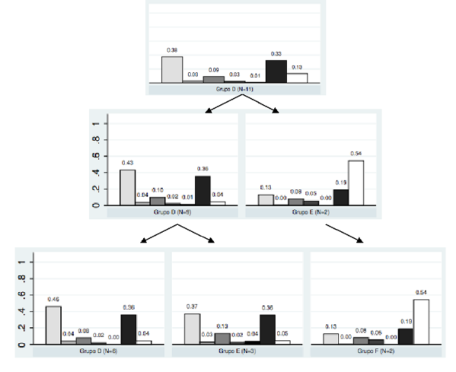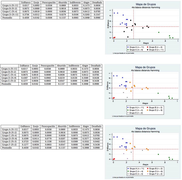 La estructura del dendograma lleva a plantear la posibilidad de considerar 4, 5 o 6 clústeres. Para tomar una decisión sobre los patrones emocionales se analizaron las tablas de promedio de cada emoción en cada clúster y los mapas de clústeres (ver Apéndice). Tanto en el dendrograma como en los mapas de clústeres puede verse que hay tres grupos de estudiantes que se mantienen estables cuando se consideran 4, 5 o 6 clústeres (Grupos A, B y C, tabla III) y un cuarto grupo que se va disgregando a medida que se aumenta el número de clústeres.