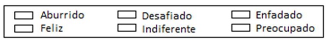 El instrumento debía ser fácil y rápido de utilizar para que los estudiantes indicaran lo que habían sentido en cada una de las 177 actividades en las que trabajarían. Por tanto, el número de emociones era un factor relevante, ya que un listado muy amplio podía generar mayor confusión a la hora de seleccionar una opción, ralentizando el tiempo de respuesta. La edad de los estudiantes influyó en la elección de las alternativas, que se incluyeron puesto que debían ser estados fácilmente reconocibles por los participantes. Por último, analizando las investigaciones en situaciones académicas generales (Holm et al., 2016; Pekrun et al., 2002; 2011) y en el contexto de la resolución de problemas matemáticos (Goldin, 2000; Op’t Eynde et al., 2006) se observaron coincidencias en tres opciones que se incorporaron al instrumento: aburrido, feliz y enfadado. Otros sentimientos analizados en esas investigaciones como, angustia, ansiedad, temor o frustración, fueron considerados, optando por incorporar la opción preocupado. Por último, se incluyó una alternativa neutra (indiferente) y otra muy utilizada en el contexto chileno, en relación con la resolución de problemas en matemáticas (desafiado).