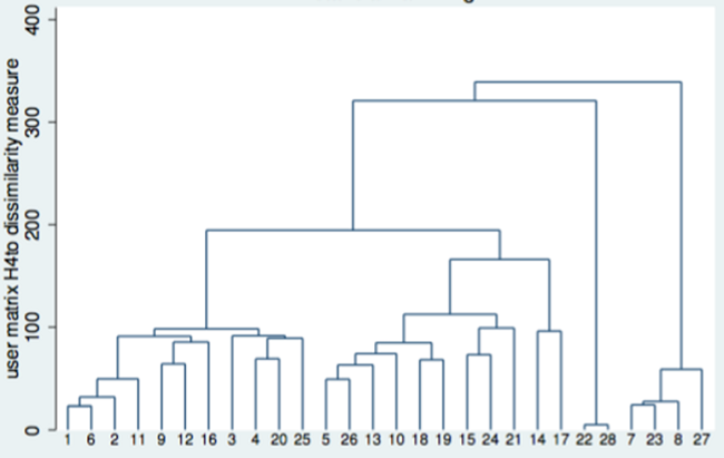 Usando la distancia Hamming para medir la separación entre dos perfiles y el método de Ward para formar los clústeres, se obtuvo el dendrograma de la figura 2, en el que puede verse, por ejemplo, que los perfiles de los estudiantes 22 y 28 son muy parecidos entre sí, así como los de los alumnos 1 y 6, o 7 y 23.