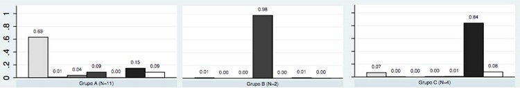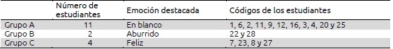 Las tablas de promedios muestran que los tres grupos que se mantienen estables están por encima del promedio en uno de los valores de la variable Emoción y por debajo en el resto (ver Apéndice). Así, el Grupo A está formado por 11 estudiantes que, en promedio, no indicaron ninguna emoción en el 63% de las actividades; el Grupo B lo componen dos estudiantes que, en promedio, en el 98% de las actividades declararon sentirse aburridos y en el Grupo C hay 4 estudiantes que, en promedio, en el 84% de las actividades señalaron que se sentían felices (ver figura 3).