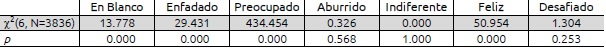Por otra parte, los resultados mostraron que existe relación entre el género de los estudiantes y las emociones que indican, X2(6, N=3836)=124.96, p<0.001. Se encontraron diferencias significativas en las respuestas en blanco y las opciones Enfadado, Preocupado y Feliz. El porcentaje de veces que se eligió Enfadado (1.6%) no permite interpretar este resultado para esta emoción. En el resto, los hombres presentaron mayor promedio de respuestas en blanco que las mujeres (M=0.44, SD=0.29 y M=0.39, SD=0.24, respectivamente) y se mostraron menos preocupados (M=0.01, SD=0.03 y M=0.07, SD=0.09, respectivamente). En la opción Feliz, los promedios son iguales (M=0.31), con SD=0.24 y SD=0.28 en el caso de las mujeres y los hombres. Esta información complementa los resultados de investigaciones realizadas en Alemania y Finlandia (Frenzel et al., 2007a; Holm et al., 2016), donde las mujeres mostraron mayor ansiedad, desesperanza y vergüenza que los hombres y un menor disfrute de la disciplina.