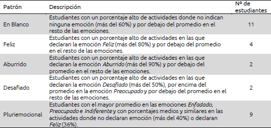 A partir de este análisis, se consideraron 5 patrones emocionales en el conjunto de los 28 estudiantes, cuyas características principales se resumen en la tabla IV.