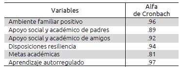 Se aplicó un cuadernillo de instrumentos que incluyó datos demográficos de los estudiantes, como la edad y el género. También se agregaron escalas que midieron el apoyo social y académico de los padres, de los amigos, el ambiente familiar positivo, las disposiciones a la resiliencia, las metas académicas y el aprendizaje autorregulado.