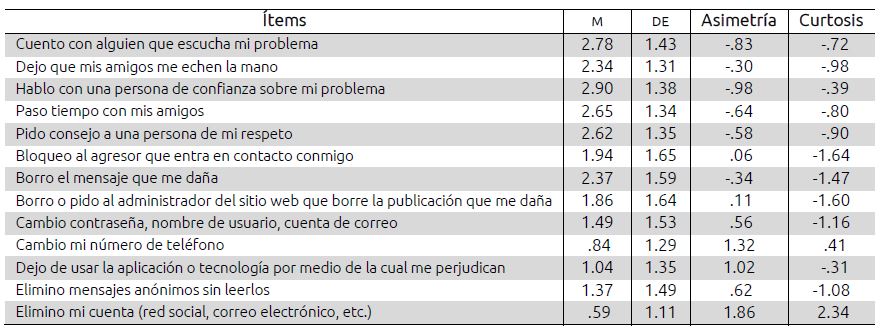 Con el objetivo de revisar la distribución de los datos se llevó a cabo un análisis descriptivo con el que se reconocen ligeras desviaciones de normalidad en seis ítems (ejemplo: “Elimino mi cuenta” [red social, correo electrónico, etc.]) (ver tabla I), lo que debe ser considerado en análisis posteriores para no afectar los resultados -como el hecho de emplear el método bootstrap en el análisis factorial confirmatorio.