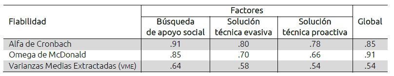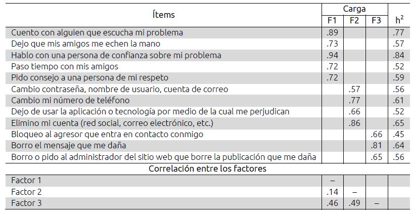 La propuesta original consideró una escala de 13 ítems agrupados en dos dimensiones (Búsqueda de apoyo social y Solución técnica). Sin embargo, como resultado del análisis factorial exploratorio se obtuvo una escala de 12 ítems agrupados en 3 dimensiones que explican el 60.52% de la varianza total del constructo (ver tabla II). La dimensión Búsqueda de apoyo social se mantuvo como la original (5 ítems, 34.77% de la varianza), mientras que la dimensión Solución técnica se dividió en 2, las cuales se renombraron como: Solución técnica evasiva (4 ítems, 19.95% de la varianza), por tratarse de acciones donde el estudiante deja de usar la tecnología por medio de la cual recibe la ciberagresión y Solución técnica proactiva (3 ítems, 5.80% de la varianza) referida a acciones para eliminar u omitir la ciberagresión recibida.