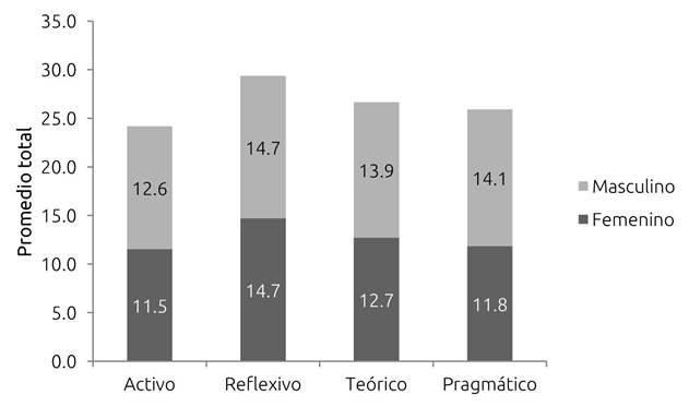 En el análisis por género no se observaron diferencias, las preferencias fueron moderadas en los estilos activo y teórico y bajo en los estilos reflexivo y pragmático ( ver figura 1); resultados parecidos obtuvieron Esguerra y Guerrero (2010), quienes encontraron que el género no está relacionado con los estilos de aprendizaje, esto puede darse porque existen otras variables que influyen, como la convivencia, procedencia, el estilo de enseñanza del profesor, la materia, las circunstancias, los compañeros y los padres (Esguerra y Guerrero, 2010; Hussain y Ayub, 2012; Mumford y Honey, 1992).
