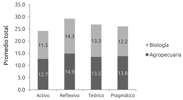 Los participantes pertenecen a las carreras de Biología (42%) e Ingeniería Agropecuaria (58%), con 21 años edad promedio. La carrera con el mayor porcentaje fue la de Ingeniería Agropecuaria (75% hombres y 25% mujeres), mientras que Biología registró una tendencia distinta: 61% mujeres y 39% hombres. Villalba (2015) observó en estudiantes de Biología y licenciatura en Biodiversidad preferencias de “muy baja” en los estilos reflexivo y pragmático y de “moderado” a “bajo” de los estilos activo y teórico, a diferencia del análisis de los estilos de aprendizaje realizado en este estudio por carrera formativa; en la figura 2 se observa que tanto para Agropecuaria como para Biología los estudiantes tienen preferencia moderada por los estilos activo, teórico, pragmático y preferencia baja por el reflexivo (Alonso et al., 1995); así, vemos que es común que los estudiantes muestren una combinación de varios estilos de aprendizaje, lo que nos ayuda a conocer patrones comunes de conducta y amplía la posibilidad de aprender en diversas situaciones (Czepula et al., 2016). En cambio, en un estudio realizado en Ecuador a los estudiantes de la Ciencia del Suelo en la Universidad de Cuenca por Quichimbo, Chérrez y Jiménez (2016) encontraron que la mayoría de los estudiantes son pragmáticos seguido de los activos, ellos comentan que esto se debe a la aplicación práctica de esta ciencia en carreras como Ingeniería Agronómica.