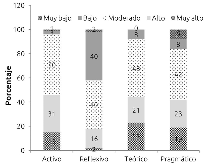 En la figura 3 se visualiza una moderada preferencia de los cuatro estilos de aprendizaje: 50% para el estilo activo, 48.4% para el estilo teórico, 41.9% para el estilo pragmático y 40.3% para el reflexivo. En todos los casos existieron estudiantes con preferencias “muy alto, alto, moderado, bajo y muy bajo” en los cuatro estilos de aprendizaje, a excepción del teórico con preferencia “muy bajo”, donde no existió ningún estudiante.