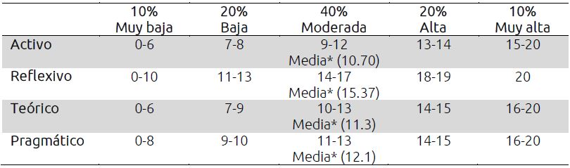 El estudio se realizó en la utpl, situada en la provincia de Loja, al sur de Ecuador. La encuesta se aplicó a los estudiantes matriculados en las asignaturas de Edafología y Conservación de Suelos de las carreras de Ingeniería Agropecuaria (37 estudiantes), de los períodos abril-agosto 2016 y octubre-febrero 2017; y de la carrera de Biología (28 estudiantes), del período octubre 2016-febrero 2017, en el caso de Biología no se aplicó debido a que la oferta del componente es anual. Los estudiantes contestaron de manera voluntaria el cuestionario chaea, el cual consta de 80 preguntas dicotómicas cortas que contemplan a los cuatro estilos y están distribuidas de manera aleatoria. El rango de valoración más alto es 20 y la nota alcanzada indica el tipo de estilo; sin embargo, la valoración de las preferencias para los estilos puede ser calificada de acuerdo a las siguientes cinco categorías: muy bajo, bajo, moderado, alto y muy alto (Alonso, et al., 1995) (ver tabla I). Pero la asignación a cada categoría no es lineal y es propia de cada estilo, por lo tanto, los autores del cuestionario han planteado una escala (baremo) propia de calificación y es la que se ha usado para este estudio; adicionalmente se incluyó en el cuestionario información referente a género, edad, carrera y ciclo académico.