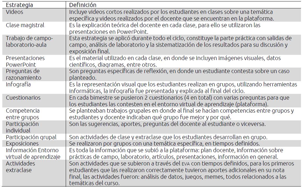 Las estrategias de enseñanza utilizadas para impartir las asignaturas se describen en la tabla II. Para la selección de las estrategias a aplicar se consideraron básicamente dos aspectos: 1) recurrir a estrategias utilizadas anteriormente en la clase de Edafología y que se considera tuvieron acogida por parte de los estudiantes; 2) el uso de estrategias propuestas por Ferreiro (2014) y Ferreiro y Espino (2014).