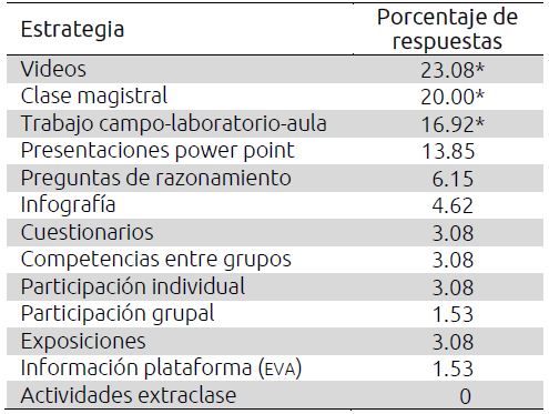 También existieron opiniones divididas y con menores porcentajes, como los cuestionarios, competencias entre grupos, participación individual y exposiciones. Algo notable es el caso del trabajo grupal, una estrategia de aprendizaje que mostró los porcentajes más bajos; con relación a esto, los estudiantes argumentaron su poca participación debido a cruces de horarios o desinterés de ciertos alumnos, incluso en algunos casos solicitaron realizar los trabajos de manera individual; en cambio, en el trabajo realizado por Lesmes-Anel et al. (2001) se evidencia que el trabajo en pequeños grupos fue bastante efectivo.