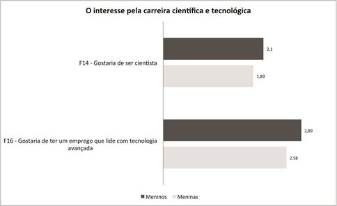 Sobre o interesse dos jovens brasileiros em seguir a carreira científica ou terem um emprego que lide com tecnologia avançada (questões F14 e F16 do questionário), observamos que tanto meninas como meninos têm pouco interesse em ingressar na carreira científica. Já os meninos gostariam mais de ter um emprego que lide com tecnologia avançada que as meninas. A Figura 1 ilustra a diferença entre meninos e meninas em relação ao interesse pela carreira científica e tecnológica.