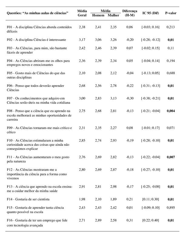 Para tanto, os dados serão apresentados da seguinte forma: 1) através das médias de meninos e meninas para todas as questões presentes na seção F e 2) através de médias de meninos e meninas para categorias (agrupamento de questões). Para a verificação de diferenças entre gênero foram utilizados testes de Mann-Whitney. Diferenças com valores de p<0,05 foram consideradas significativas e estão destacadas nas tabelas através do uso do negrito. As médias obtidas na totalidade das 16 questões da seção F "As minhas aulas de Ciências" podem ser observadas na Tabela 1.