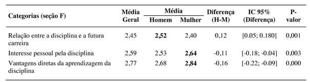 As demais questões foram analisadas em três categorias. O critério utilizado para o agrupamento foi reunir questões com a mesma orientação. Algumas destas questões foram agrupadas por outros pesquisadores, tais como Ogawa e Shimode (2004), no Japão, e Jenkins e Nelson (2005), na Inglaterra. As médias obtidas nestas categorias podem ser observadas na Tabela 2.