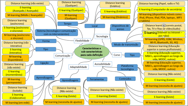 De acordo com o que foi referido anteriormente, a Figura 1 mostra um esquema gráfico para que de uma forma simples, objetiva, rigorosa e clara se possa identificar as características (caixa com fundo branco) e subcaracterísticas (caixa com fundo azul) a ter em conta quando se pretende construir as definições de distance learning, e-learning e m-learning.