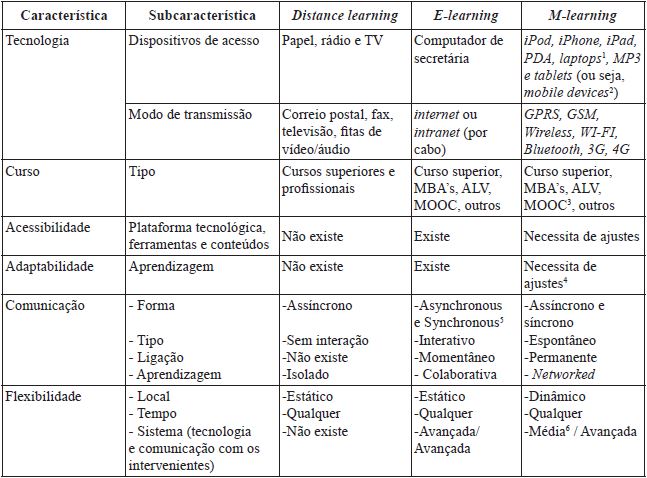 A Tabela 1 pode ser dividida em dois grupos, o primeiro grupo que é composto pelas características principais e subcaracterísticas (coluna 1 e 2 da esquerda para a direita) e o segundo grupo (colunas 3, 4 e 5 da esquerda para a direita) com o resultado das características e subcaracterísticas para distance learning, e-learning, m-learning. O segundo grupo possui algumas notas de rodapé para as palavras com números. O primeiro grupo deverá ter em conta os seguintes significados: