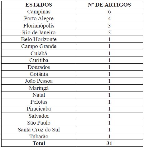 Campinas (6), Porto Alegre (4), Florianópolis e Rio de Janeiro (3 cada) são as cidades-sede das revistas que concentraram mais da metade dos artigos: 16 (Tabela 3).