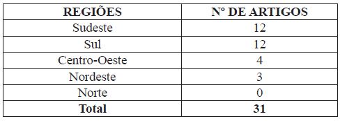 No que concerne à região brasileira em que se situam as revistas, as regiões Sudeste e Sul tiveram 12 artigos publicados cada uma; a Região Centro-Oeste contribuiu com 4 artigos e a Região Nordeste com 3. Não catalogamos artigos em revistas publicadas na Região Norte (Tabela 4).