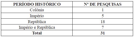 Em relação à periodização histórica, o período republicano se destaca com a maioria dos trabalhos: 18 (Tabela 6).