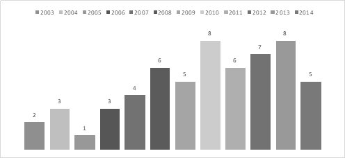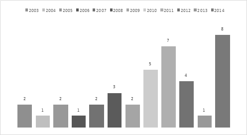 Algumas dessas pesquisas foram desenvolvidas por professoras, sobretudo em exercício na Educação Básica, incluindo EJA - Educação de Jovens e Adultos, bem como na Educação Infantil. A produção foi crescente, entre os anos de 2008 e 2014, registrou-se o maior número de produção que abordou problemáticas relativas à educação das relações étnico-raciais em instituições educacionais, destacando-se os anos de 2010 e 2013 (Gráfico 1). É provável que a proximidade dos dez anos de promulgação da Lei 10.639/2003, completados em 2013, tenha despertado interesse no sentido de avaliar em que medida e como a sua implantação vinha ocorrendo.
