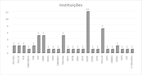As instituições onde os trabalhos foram defendidos foram 25 no total, com bastante dispersão (Gráfico 2). A instituição onde se realizou o maior número de pesquisas relativas à educação das relações étnico-raciais em instituições escolares foi a Universidade Federal do Mato Grosso (UFMT), com 12 investigações, seguida da Universidade Federal de São Carlos (UFSCar) com 7 e da Universidade de São Paulo (USP), Universidade Estadual de Campinas (UNICAMP) e Universidade do Estado da Bahia (UNEB) com 5.