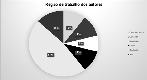 As revistas nos quais os artigos foram publicados foram na maioria da região Sudeste, com índice pequeno na região Centro-Oeste e na região Sul, ainda menor na região Nordeste e nenhum na região Norte. Na distribuição de região das instituições dos autores, 47% foram da região Sudeste, 13% da região Sul, 11% da região Norte, 10% da Centro-Oeste e 8% da Nordeste (Gráfico 3).
