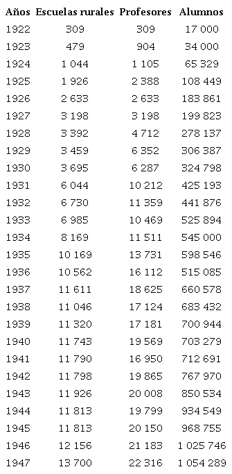 México tuvo la edad de oro de las escuelas rurales en 1920, un período de expansión de las escuelas primarias, conocido en la historiografía mexicana como: “[...] la edad de oro de la educación rural” (ROCKWELL, 2007, p. 45), cuando la SEP, con José Vasconcelos como jefe de la nueva agencia, comenzó el diseño, organización y operación de la escuela rural mexicana. La tabla de abajo muestra el crecimiento de las escuelas rurales en México, entre 1922 y 1947: