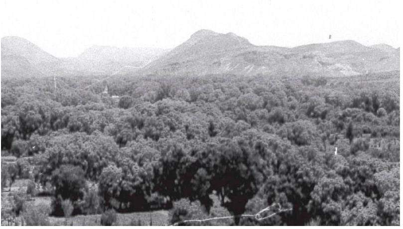 Entre el cañón que forman dos cadenas de sendas montañas de colores ocre salpicadas apenas por el verdor de la flora silvestre, se encuentra una comunidad llamada El Pueblito, la cual se sitúa a 5 km. de la cabecera municipal de Santa María del Río. Ésta se extiende a lo largo de dos caminos de terracería al pie de las montañas, escoltados por los postes de electrificación y la tubería semienterrada que conduce el agua potable desde un pozo excavado en un arroyo próximo, y divididos sólo por el cauce casi seco del río Santa María. Junto a éste, a pesar de la creciente sequía, se erguían fragantes sauces y majestuosos nogales que dejaban caer generosamente sus frutos sobre las milpas y huertas que limitaban las riberas y constituían la fuente de sustento de un bajo porcentaje de la población. Una gran parte se sostenía con las remesas que los padres, algunas madres y, en su mayoría, hijos, enviaban desde el vecino país del norte al cual habían emigrado ilegalmente. El resto se ocupaban como jornaleros, obreros, albañiles y pequeños comerciantes. La siguiente imagen muestra las montañas y nogales de Santa María del Río: