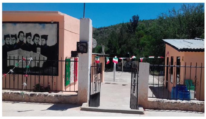 Era un salón muy grande de adobe, dentro tenía un escenario como de teatro, donde se presentaban los bailables, rondas y canciones en los festivales, como el 10 de mayo. Y había otro cuarto más chico donde la maestra se dormía y había un cuartito donde cocinaba. El piso del salón era de cemento, el del cuarto de ladrillo y el de la cocina era de tierra. La escuela estaba cercada con piedras y ramas de mezquite y granjeno. Los pupitres eran de madera y nos sentábamos en filas. El pizarrón era de madera pintado de negro. En los festivales, una señora llevaba su radio para amenizar la fiesta. Nos festejaban el día del niño, nos daban agua de limón y galletas saladas.