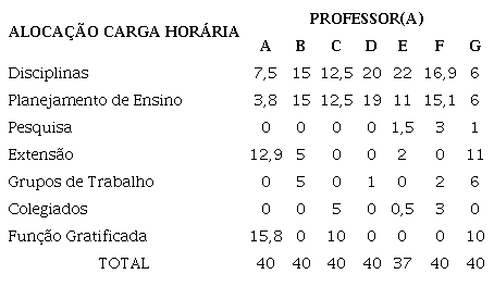 Na tabela 1 ressalta-se a alocação de carga horária em grupos de trabalhos, relacionados a diversas atividades coletivas da instituição, como a organização de eventos e a representação em colegiados.
