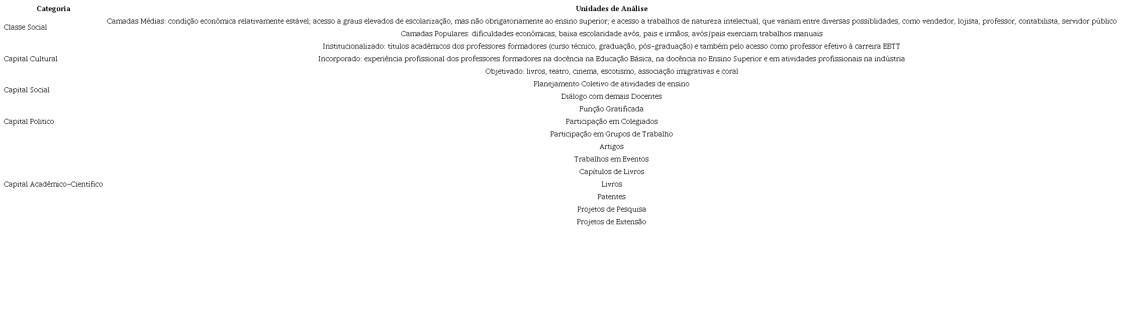 A partir do referencial teórico-metodológico de Bourdieu, duas categorias principais se destacaram na análise das entrevistas: classe social e capital. Dessa forma, discute-se, nesse tópico, essas duas categorias de modo articulado, estabelecendo relações que permitem evidenciar a composição dos capitais dos professores formadores entrevistados, bem como elementos que constituem o seu habitus.