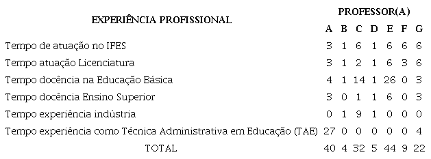 As Professoras B e D, como substitutas, têm o menor tempo de atuação nos Institutos Federais e também pouco tempo de experiência profissional em outros espaços. Todos os professores que são efetivos já passaram pelo período de estágio probatório. Em relação ao tempo de experiência na Educação Básica, sobressaem-se os Professores C e E.
