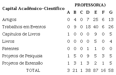 Na composição do capital acadêmico-científico, foram considerados, os projetos de pesquisa, projetos de extensão, publicações e patentes. Portanto, para cada produção, o professor formador recebeu 1 ponto.