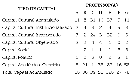 Na tabela 4, identifica-se que, ao considerarmos apenas o capital cultural acumulado, o Professor C e a Professora E se sobressaem devido ao tempo de experiência docente na Educação Básica. Já ao analisarmos o capital acadêmico-científico, realça-se a produção das Professoras E e G.