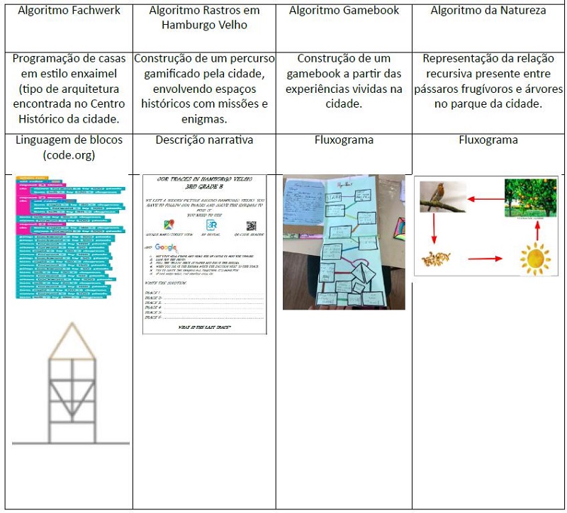 O Algoritmo Fachwerk envolveu a construção do algoritmo na plataforma code.org a fim de executar a construção de casas enxaimel, arquitetura esta encontrada no Centro Histórico da cidade. Os estudantes puderam construir noções de geometria plana e ângulos e programar algoritmos relacionados com as aprendizagens sobre a cidade. O algoritmo Rastros em Hamburgo Velho (Menezes et al., 2022) foi construído na forma de texto, a fim de desenvolver um percurso híbrido quanto ao espaço físico e digital permeado de enigmas e pistas sobre a história da cidade, incluindo os principais pontos turísticos visitados. O algoritmo Gamebook (Menezes; La Rocca; Schlemmer, 2023) fez parte da construção de histórias gamificadas, inventadas pelos estudantes, envolvendo as diferentes experiências na cidade. Estas foram transformadas em um livro-jogo em que a mecânica e dinâmica destes jogos foi convertida em um algoritmo de fluxograma criado pelos estudantes. O Algoritmo da Natureza (Menezes et al., 2021) emergiu das experiências no contexto da pandemia da Covid-19, em 2020, quando o espaço da cidade redimensionou-se ainda mais a partir de plataformas digitais, entre elas o Google Earth. Esse algoritmo foi construído a partir da interação entre os estudantes, pássaros e árvores do principal parque da cidade na plataforma Google Earth. A partir do habitar redes, em que as informações foram trocadas não somente entre os humanos, mas com todo o contexto do parque, outra noção de algoritmo construiu-se, aquela que transcende a sua construção pelo humano e se estende à atividade computante de todos os seres vivos.