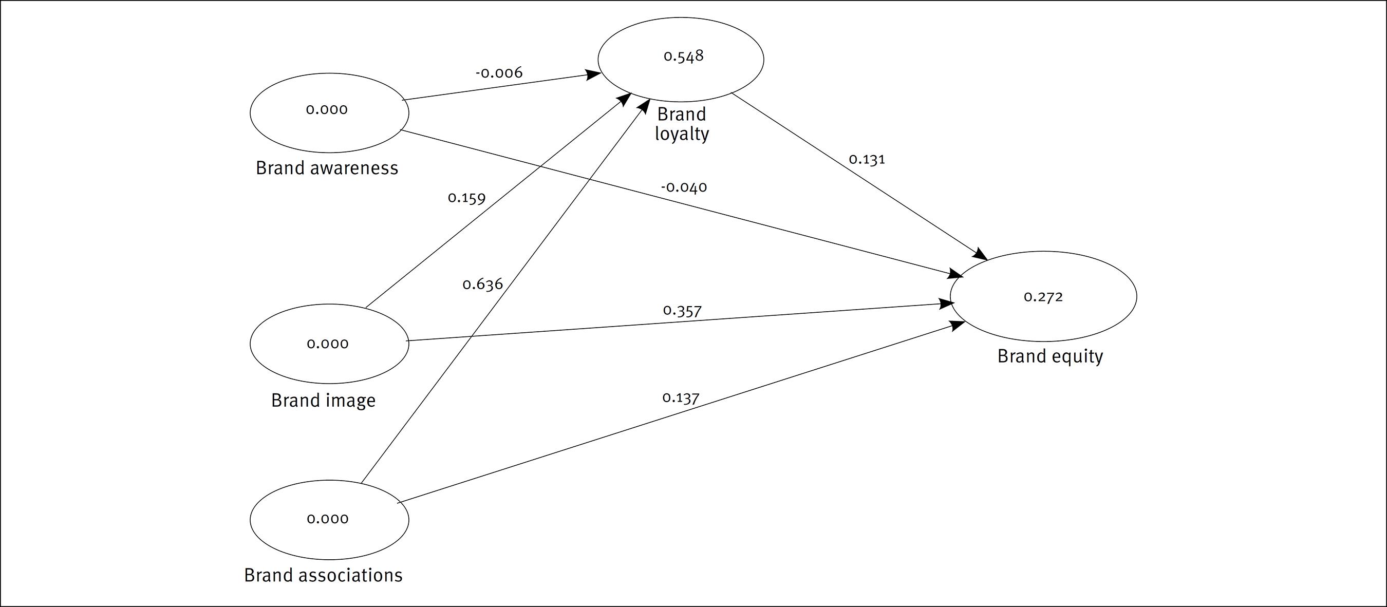 Figure 2, shows the results of the analysis. The corrected R2 in the figure refers to the explanatory power of the predictor variable(s) in the respective construct. All the three independent variables (Brand Awareness, Brand Image, and Brand Association) explain 54.7 per cent of Brand loyalty (R2 = 0.574), while these three variables and brand loyalty altogether explain 27.1 per cent of Brand equity (R2 = 0.271). With regard to model validity, Chin et al. (2008) classified endogenous latent variables as substantial, moderate, or weak based on the R2 values of 0.67, 0.33, or 0.19 respectively. Accordingly, Brand loyalty (R2 = 0.574) can be described as moderate, while Brand equity (R2 = 0.271) can be described as weak.