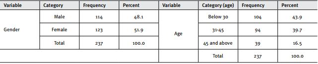 Table 1 shows the results of respondent demographics. As to gender, 48.1 percent of the respondents were male, while 51.9 percent were females. This shows a relatively similar number of respondents from both genders. With regards to age, 43.9 percent of respondents were in the age group of 30 and below, and 39.7 percent were in the group of 31-45 years. Finally, 16.5 percent were in the bracket of 45 years and older. This shows that the sample represents a mix of various generations in terms of age. This mix of age and gender supports the purpose of study.