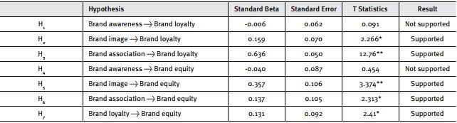 The complete results of the structural model and hypotheses testing are shown in Table 3. Results show a strong support for five of the seven hypotheses of the study. H1 hypothesized that brand awareness influences brand loyalty significantly, which was not supported by results (H1: b = -0.006, t = 0.091, sig > 0.05). H2 hypothesized that brand image significantly affects brand loyalty, which was supported by results (H2: b = 0.159, t = 2.266, sig < 0.05). A strong support was also found for H3, which hypothesized a significant effect of brand association on brand loyalty (H3: b = 0.636, t = 12.76, sig < 0.01). Results did not support H4, which hypothesized that brand awareness predicts brand equity significantly (H4: b = -0.040, t = 0.454, sig > 0.05). H5 hypothesized that brand image significantly affects brand equity, which was supported by results (H5: b = 0.357, t = 3.374, sig < 0.01). Support was also found for H6, which hypothesized a significant effect of brand association on brand equity (H6: b = 0.137, t = 2.313, sig < 0.05). The last hypothesis was H7, which hypothesized significant effect of brand loyalty on brand equity. Results supported this hypothesis (H7: b = 0.131, t = 2.410, sig < 0.05).