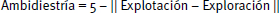 Ambidiestría: es la variable dependiente. De acuerdo con Li, Vanhaverbeke, y Schoenmakers (2008), la ambidiestría tiene diferentes niveles o dominios secuenciados a lo largo de la cadena de valor de la empresa: el científico, el tecnológico y el de producto/mercado, siendo el último en el que se plasma el esfuerzo de investigación y desarrollo de tecnología previos. Por tanto, este último dominio, puede verse como consecuencia de los dos anteriores. Por otro lado, Cao et al (2009) descompusieron el constructo de la ambidiestría en dos dimensiones, el equilibrio y el nivel. La primera define el equilibrio entre las orientaciones explotadora y exploradora (medida con la diferencia), y es más expresiva de la ambidiestría en empresas con restricciones de recursos, como es el caso de las PyMEs. La segunda se obtiene de la combinación de la explotación y la exploración (medida con el producto), y es más útil en empresas con un gran acceso a recursos. Tomando como partida estas propuestas, hemos medido la explotación y la exploración con los ítems relativos a mercado (Tabla 1) de las escalas propuestas por Lubatkin et al (2006), y hemos calculado la ambidiestría como la diferencia entre explotación y exploración (dimensión de equilibrio), de acuerdo con la siguiente fórmula: