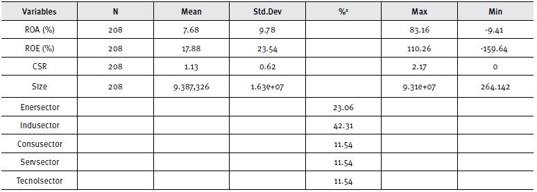 In this study, we have chosen the financial option and used ROA (return on assets) and ROE (return on equity), given its possible influence on the future development of CSR activities, according to information provided by the database used. We have also chosen these measures of performance in financial terms so as to confirm our results with those obtained in previous findings.
