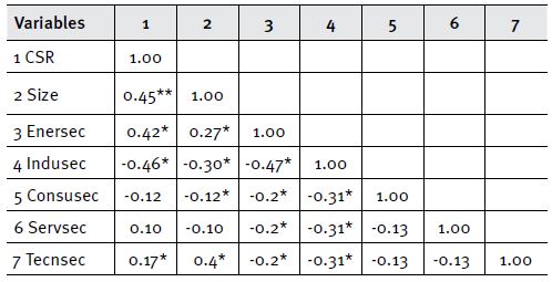 As Table 1 shows, there is a high level of heterogeneity among the firms in the sample, as the ranges of profitability and size indicate. Basic Materials sector stands out as the top sector followed by Industry and Construction. There is also a high level of variability in the CSR indicator used to measure the objective of this study in the companies that make up the sample, so this value remained low over the analyzed period.