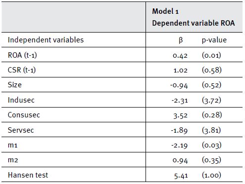 Tables 3 and 4 show the result of the GMM estimation used to test the hypotheses, with the size of the firms and their sectors controlled for. Performance is the dependent variable, and the explanatory variables are CSR lagged by period, firm size, and the activity sector to which it belongs. A lag was also included in the dependent variable.