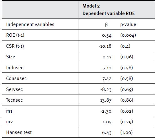 Model 2 shows a negative but not significant relationship between financial ROE and the CSR indicator, and this result coincides with those of Aupperle et al. (1985), McWilliams and Siegel, (1997, 2000, 2001), Angla-Jiménez and Setó-Pamiés (2009, 2011), Gil et al. (2009), Bajo and Durán (2009), and García-Castro et al. (2010) in the case of Spain.