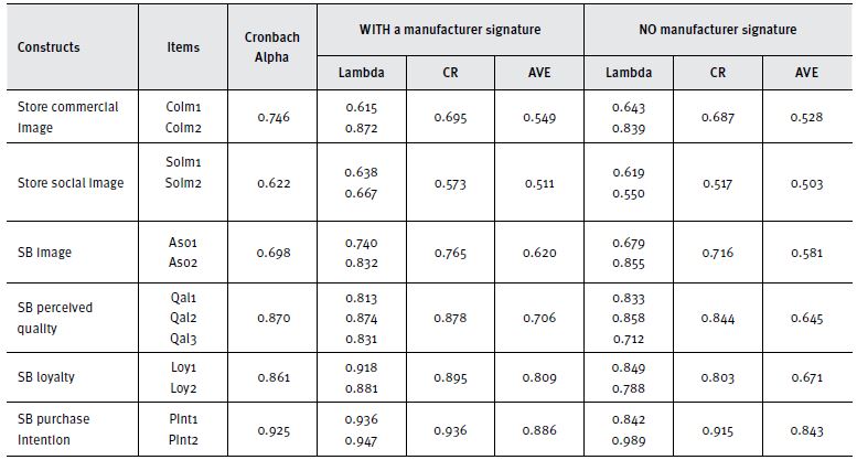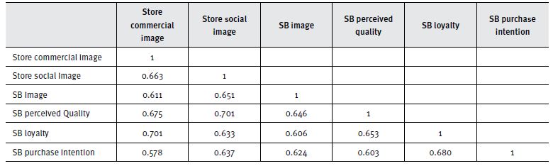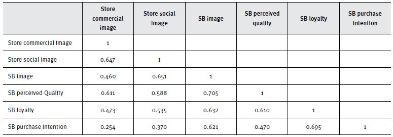 Finally, the discriminant validity of the scale was examined for all possible paired combinations of constructs. Correlation coefficients were calculated both for store brands with a manufacturer signature (Table 3) and store brands without it (Table 4), with strength ranging from low (0.245) to high (0.701), and significant at the 0.05 level. Each latent variable's AVE was larger than the squared correlation between each pair of latent variables, thus demonstrating the good discriminant validity of the scale (Fornell & Larcker, 1981).