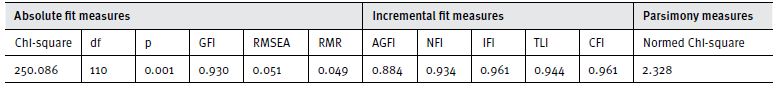Following Anderson and Gerbing's (1988) methodological proposal, the data analysis adopts a two-step approach. The first stage involves assessing the measurement model, and the second stage proceeds to test the structural relationships and research hypotheses among the constructs. Structural equation model was carried out with Amos 18.0 in order to analyze the proposed model, using maximum likelihood estimation, thus providing a confirmatory factor analysis (CFA) to test the overall fit of the measurement model. For this model, the comparative fit index (CFI), root mean square error of approximation (RMSEA), Tucker-Lewis Index (TLI), and root mean square residual (RMR) all complied with the threshold levels according to Hair et al. (1999). All of the obtained fit measures indicated that the structural model was acceptable (X2/ df = 3.094; p < 0.000): RMSEA = 0.054; RMR = 0.041; TLI = 0.959; and CFI = 0.972).