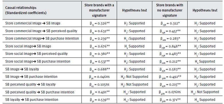 Comparing the standardized coefficients obtained, the following results should be highlighted (Table 6). The results obtained report different results for both types of store brands. Firstly, we found that the variable with highest impact on consumers' purchase intention was store brand loyalty for brands with a manufacturer signature (β56 = 0.539**) and store brand image for brands without a manufacturer identification (β36N = 0.492**). Secondly, in terms of effect size, the variables that seem to contribute most to store brand purchase intention for brands with a manufacturer signature are store brand loyalty (β56 = 0.539**), followed by store social image (β26 = 0.537**), store brand perceived quality (β46 = 0.491**), and store commercial image (β16 = 0.239**). However, store brand loyalty showed no statistical significance on purchase intention (β45 = 0.105ns), as this relationship was in the expected direction, but failed to reach statistical significance. Finally, the evaluation of store brands without a manufacturer identification showed that the variable with highest influence on purchase intention was store brand image (β36N = 0.492**), followed by store commercial image (β16N = 0.283**), and store social image (β26N = 0.212**), whereas no significant evidence was found for the relationship between store brand perceived quality and purchase intention (β46N = 0.076ns).
