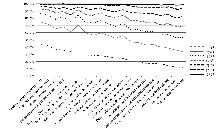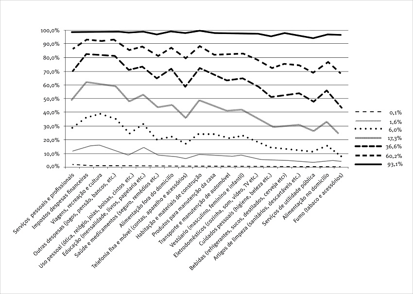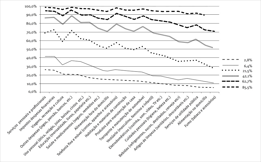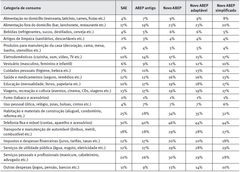 O oposto ocorre com o critério ABEP antigo (Figura 2), que classifica uma pequena percentagem (6,0%) dos domicílios nos três segmentos mais abastados da sociedade brasileira e grande concentração nos estratos mais pobres. Os três primeiros segmentos respondem por entre 9% e menos que 40% do consumo total em todas as 20 categorias de bens e serviços. Observa-se que, mesmo nas categorias de despesas não essenciais, os segmentos nos dois extremos (mais rico e mais pobre) são insignificantes para todos os 20 mercados estudados.