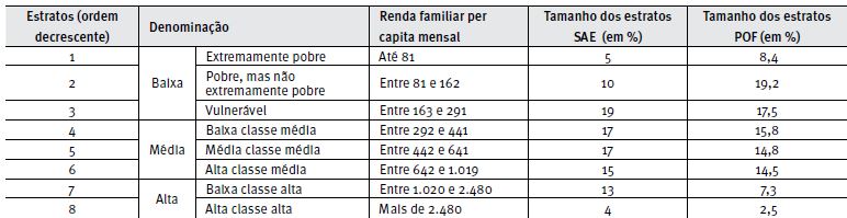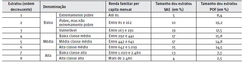A SAE limitou o critério a uma variável, renda familiar corrente per capita. Selecionada a variável-chave, originada da Pesquisa Nacional por Amostra de Domicílios (PNAD), utilizou um critério de vulnerabilidade familiar para estabelecer limites superior e inferior da classe média, considerando o interesse desse órgão no aprimoramento de políticas públicas voltadas para essa classe. A partir da observação empírica dos movimentos de ascensão e queda de renda da população brasileira nos últimos anos, a SAE definiu o grau de vulnerabilidade de um domicílio à condição de pobreza - estabelecida como a renda corrente declarada per capita inferior a R$ 140,00 mensais - em algum momento dos próximos cinco anos (Brasil, 2012). Tomando por base o grau de vulnerabilidade, dividiu a população brasileira em três grupos, com o propósito de maximizar a homogeneidade dentro de cada grupo, utilizando um critério denominado polarização. Estabelecidos os pontos de corte inferior e superior de cada classe socioeconômica - baixa, média e alta -, a Secretaria estabeleceu subdivisões dentro de cada classe, objetivando inclusive comparações com o critério da ABEP. Por meio dessa subdivisão, a SAE definiu três grupos componentes da classe baixa (extremamente pobre, pobre, mas não extremamente pobre, e vulnerável); três grupos para a classe média (baixa classe média, média classe média e alta classe média) e dois grupos para a classe alta (baixa classe alta e alta classe alta). Portanto, a estratificação da sociedade brasileira foi definida em oito grupos, os quais representam, para o ano base de 2009 e a preços de abril de 2012, a seguinte distribuição percentual: