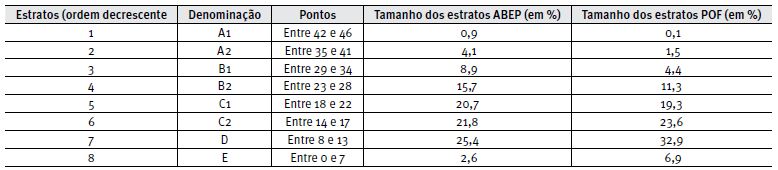 Numa sociedade dinâmica como a brasileira, é de esperar que a estratificação socioeconômica mude num período relativamente curto e, portanto, a definição dos estratos deve acompanhar essa dinâmica. Por outro lado, esse tipo de segmentação da população de domicílios deve ser feito com base em dados fidedignos de uma amostra representativa do total da população do País, como são os dados da POF coletados pelo IBGE. Consequentemente, é necessário revisar o critério de estratificação tão logo novos dados de consumo e indicadores socioeconômicos da POF sejam disponibilizados.